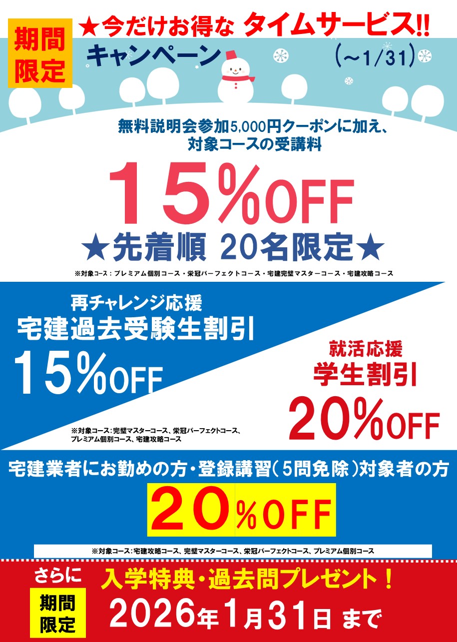 - 【2026年度受験用】11月中旬から宅建合格講座のご相談を承ります。説明会・個別カウンセリングは完全予約制となります