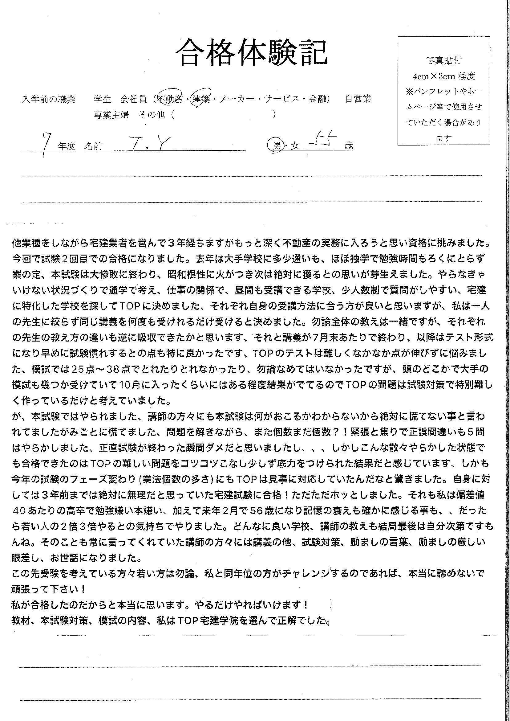 - 通信やオンラインだとサボってしまう事がわかりきっていたので通学で通えるTOPさんにお世話になりました。通いやすく宅建専門の学校であったことも決め手になりました。